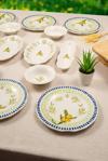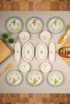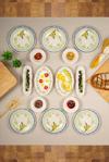 Mavi kenar çizgileriyle çevrelenen yeşil ve sarı tonlar, Akdeniz’in doğal armonisini sofraya taşır.