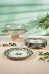 Fecra Majestic Green 8 Parça Sunum Seti, sofralarınıza yalnızca işlevsellik değil, aynı zamanda görsel bir şölen sunmak için tasarlandı. Yeşil desenlerin estetik güzelliği porselenin asaletiyle birleşerek tatlı ve sunumlarınıza ayrıcalık katıyor.