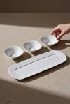 Üç adet kase ve şık servis tabağı sayesinde sofranızda düzenli ve göz alıcı bir sunum sağlar. Minimal çizgileriyle modern mutfakların vazgeçilmez tamamlayıcısıdır.