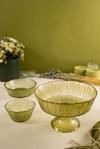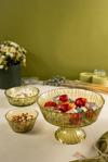 Üç farklı boy kase, her kullanımda farklı bir görev üstleniyor: ayaklı kase zarif bir sunum merkezi oluştururken, küçük ve orta boy kaseler atıştırmalık, meyve veya şeker sunumlarında şıklığı tamamlıyor. Camın pürüzsüz yüzeyi, ışığı doğal biçimde kırarak masanıza sıcak bir ışıltı yayıyor.