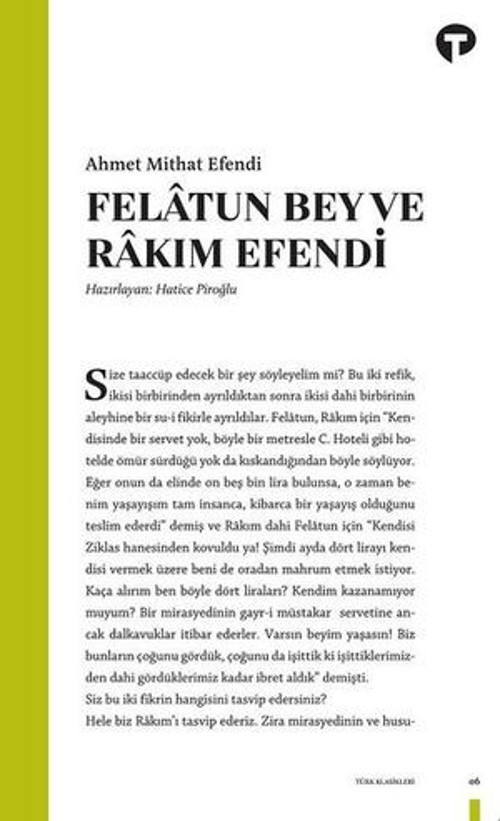 Türk edebiyatının ilk alafranga, züppe tipi Felâtun Bey; tam karşısında ölçülü ve çalışkan Râkım Efendi… Ahmet Mithat Efendi, popüler Türk romanının öncülerinden sayılan Felâtun Bey ve Râkım Efendi’de, Batı’yla karşılaşma ve modernleşme deneyimini ele almakla kalmıyor, doğru modernleşmeye dair formüller sunarak okurlarına rehberlik etmeyi de amaçlıyor.