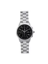 Tamamı gümüş renk gövdeye sahip bu model, siyah kadranı ile zarif bir kontrast oluşturur.