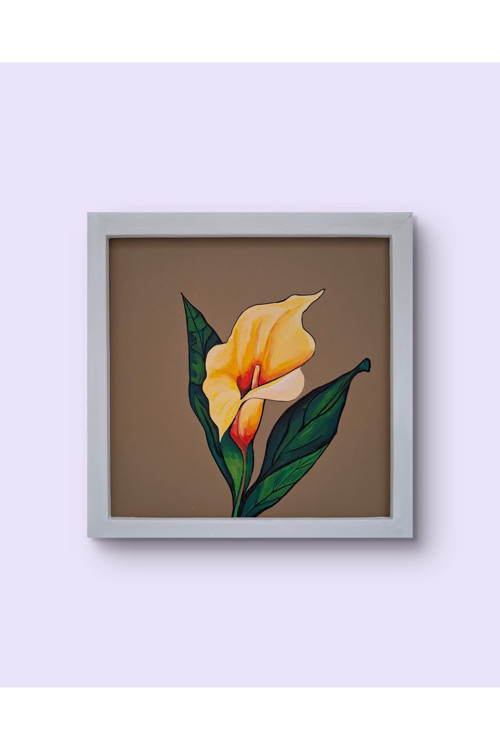 Aurelia Calla Künye Koleksiyon: Floravera Eser Adı: Aurelia Calla Kod: FV-002 Boyut: 22 × 22 cm (çerçeve dâhil) Yüzey / Malzeme: MDF plaka Teknik: Akrilik, %100 el yapımı Çerçeve: Ahşap, el boyaması (bütünleşik) Yıl: 2025 Orijinallik: Tekil üretim Mini Manifesto Altınsı sarı bir nefes: zarafet ve sükûnet.
