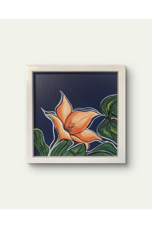 Amber Bloom Koleksiyon: Floravera Eser Adı: Amber Bloom Kod: FV-008 Boyut: 22 × 22 cm (çerçeve dâhil) Yüzey / Malzeme: MDF plaka Teknik: Akrilik, %100 el yapımı Çerçeve: Ahşap, el boyaması (bütünleşik) Yıl: 2025 Orijinallik: Tekil üretim Mini Manifesto Gece mavisinin derinliğinde açan amber tonlarındaki çiçek, gizemli bir parıltı taşır.