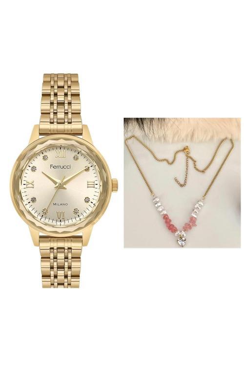 Ferrucci Kristal Kadranlı Taşlı Çelik Kadın Kol Saati+ İncili Çelik Kolye Hediye