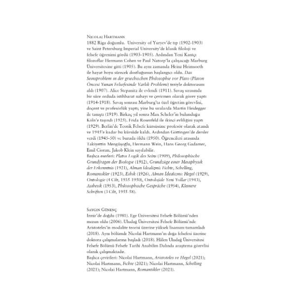 Hartmann’ın, görüşlerini mümkün olduğunca objektif bir bakış açısıyla ve tarihsel gelişimi esas alarak açık bir dille sunduğu bu eserini, Saygın Günenç çevirisi ve Harun Tepe’nin Sunuş’uyla okurlarımıza sunuyoruz.