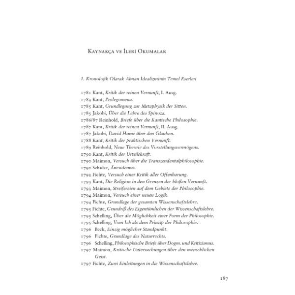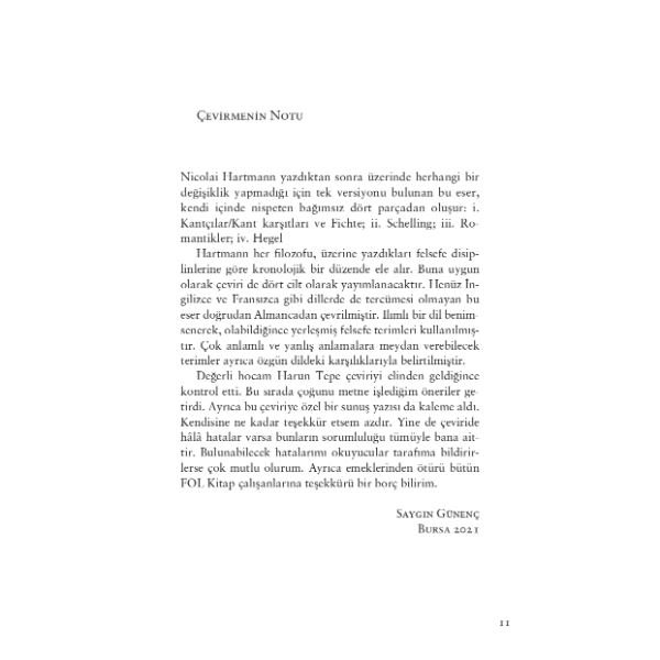 Alman filozof Nicolai Hartmann’ın kaleme aldığı bu kitap, Kant sonrası felsefenin en önemli uğraklarından olan Alman İdealizmi’nin öyküsünü anlatmaktadır. 18. yüzyılın sonunda, Kant’tan yola çıkar bu öykü. Felsefe tarihinin bu uğrağında tüm felsefe, Kant’ın yorumlanması ve ona karşı takınılan tutuma göre şekillenir. Kant’ın ilk eleştirmenlerinden Reinhold’a bağlanarak Schulze, Maimon, Beck, Jacobi ve Bardili gibi, eleştirel felsefenin bir dizi savunucusu ve karşıtı ortaya çıkar.