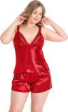 Findit Büyük Beden Kırmızı Saten Babydoll Şort Takımı 1066
