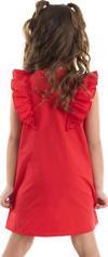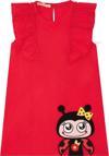 Kırmızı poplin kumaştan, omuzdan göğüse fırfır detaylı elbise. Elbisenin üzerindeuğur böceği aplikesi vardır.