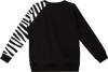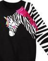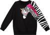 Orta kalın, pamuklu kumaştan üzeri zebra baskılı sweatshirt. Reglan kol kesim. Zebranın yelesi varaklı pembe kumaştan fırfırlı olarak tasarlanmıştır. Tüm Denokids ürünleri çocuk güvenliği düşünülerek üretilmiştir ve iğne dedektörlerinden geçirilmiştir.