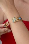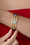 Bileziğin üzerinde yer alan firuze taşlar, hem enerjisi hem de göz alıcı mavisiyle tasarıma canlılık katar. Geometrik yerleşimlerle süslenmiş bu taşlar, klasik altın dokusuna modern bir kontrast sunar. Günlük hayatta sade kombinlerinize renk katarken, özel davetlerde de göz kamaştırıcı bir aksesuar haline gelir.