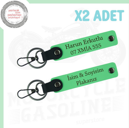 Miaju Fıstık Yeşili Tonunda, Motor Tutkunları İçin İsim ve Plaka Detaylı Deri 2'li Anahtarlık, Hatıralık