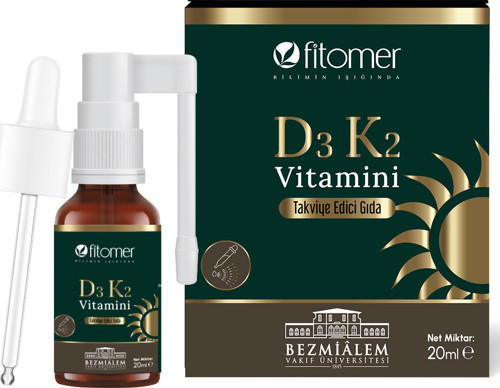Fitomer Vitamin D3 ve Vitamin K2 Sprey Damla, vitamin D3 ve vitamin K2 içeren takviye edici gıdadır. Sprey formu sayesinde pratik kullanım sunar. Günlük beslenmeye destek amacıyla formüle edilmiştir.