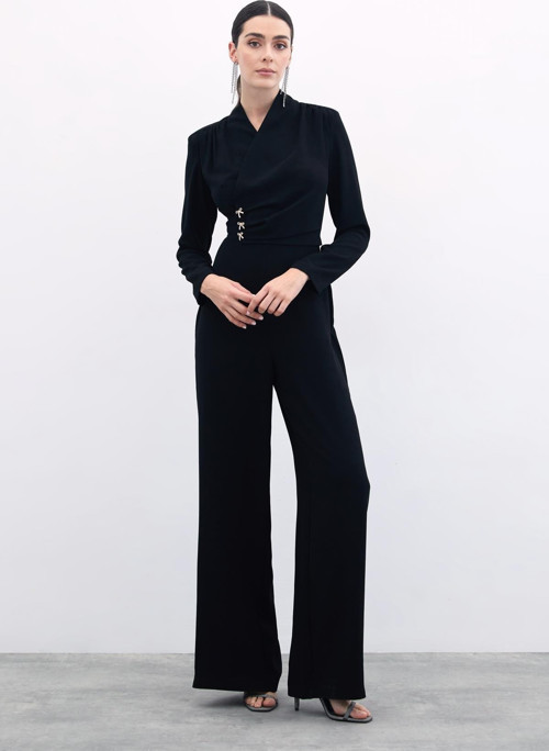 Kruvaze yaka, uzun düz kol, arka fermuarlı, salaş paça, fiyonk aksesuarlı krep tulum.
