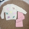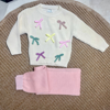 Pastel fiyonk aplikeleri ve yumuşak triko dokusuyla 3–10 yaş kız çocuklar için hem sevimli hem konforlu iki parçalı takım!