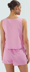 Bu şık ve rahat plaj takımı, %100 pamuk kumaştan üretilmiştir. Flamlı pamuk dokusu, hem şık bir görünüm sunar hem de nefes alabilir özelliği ile gün boyu konfor sağlar. Bisiklet yakası ve kolsuz tasarımı, sıcak yaz günlerinde serin kalmanıza yardımcı olur. Rahat kesim şortlar ise hareket özgürlüğünüzü kısıtlamaz. Ürün, modelin ölçülerine göre S-36 bedendir. Ön boyu 46 cm'dir. Hafif ve kolay bakımı sayesinde, yaz tatillerinizin vazgeçilmez parçası haline gelecektir.