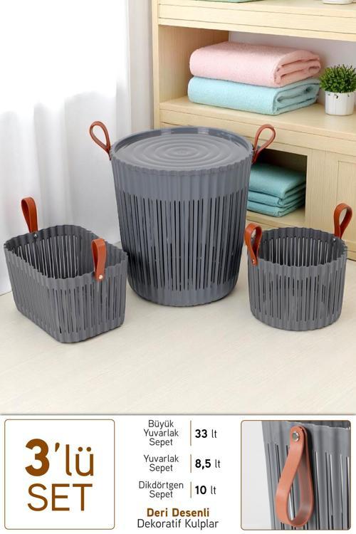 İronika Flex 3lü Banyo Seti Deri Desenli Kulplu Lüx Banyo Mutfak Organizeri Çamaşır Sepeti Düzenleyici Antrasit