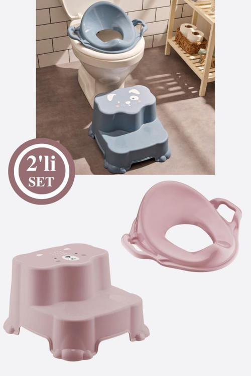 Flosoft Kaydırmaz Çift Basamaklı Çocuk Taburesi ve Klozet Tuvalet Alıştırma Adaptörü 2'li Set PEMBE