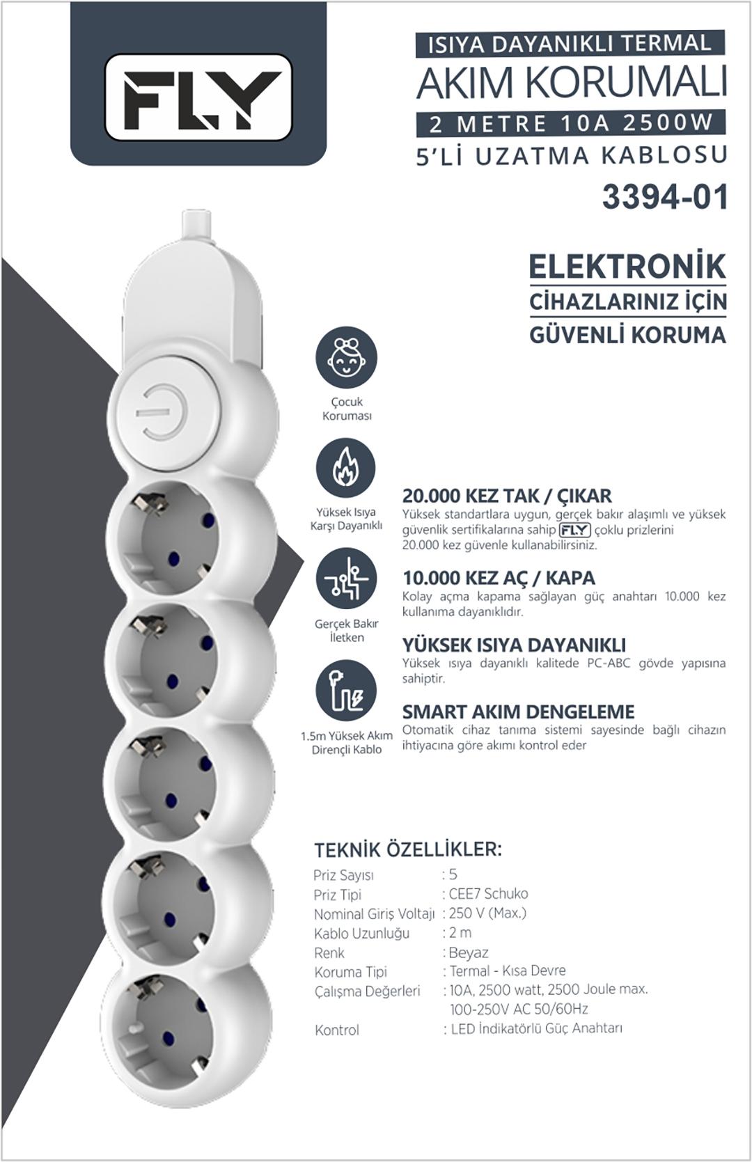 FLY FLY-3394-01 5'li Akım Korumalı Priz,2m,10 A 2500W