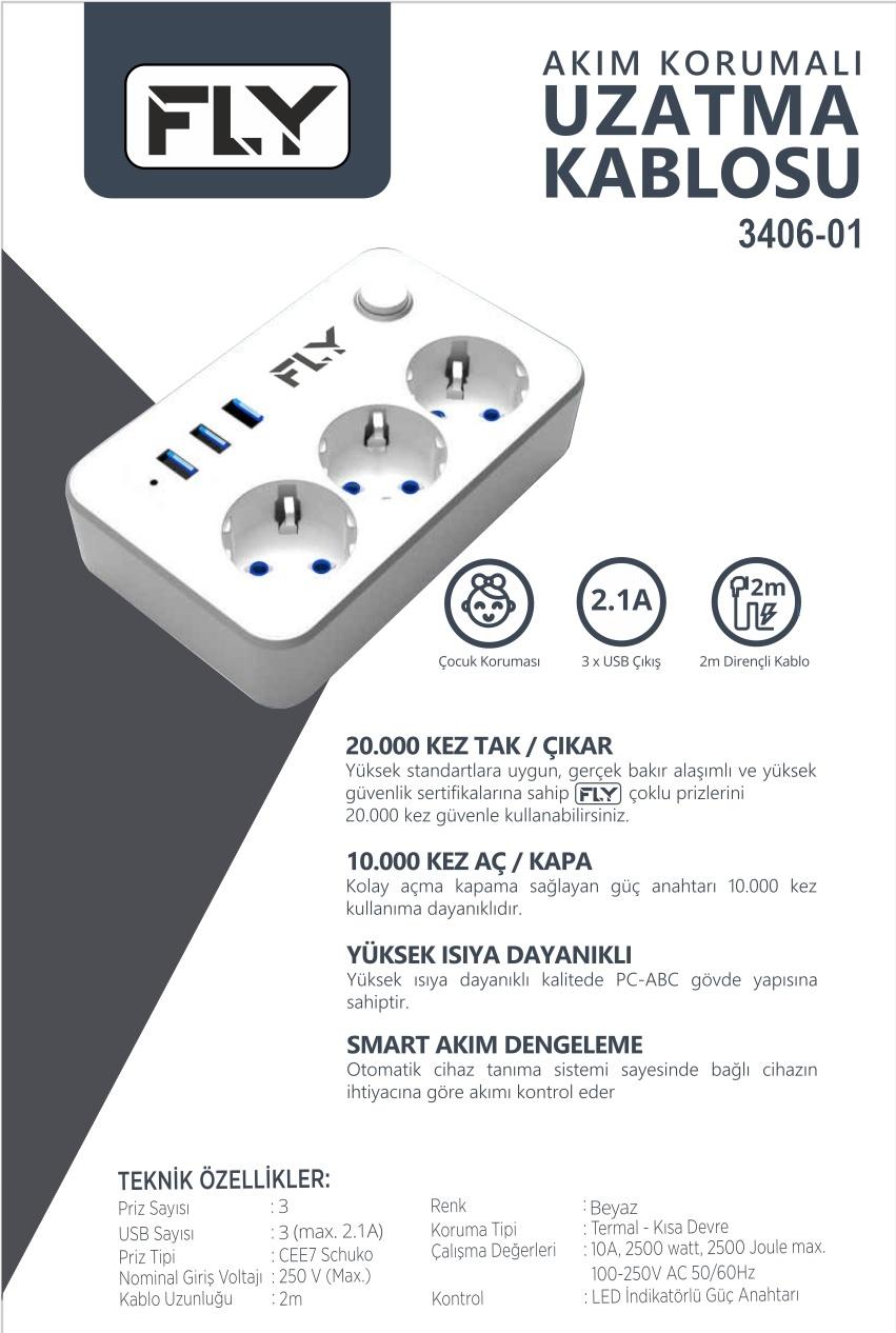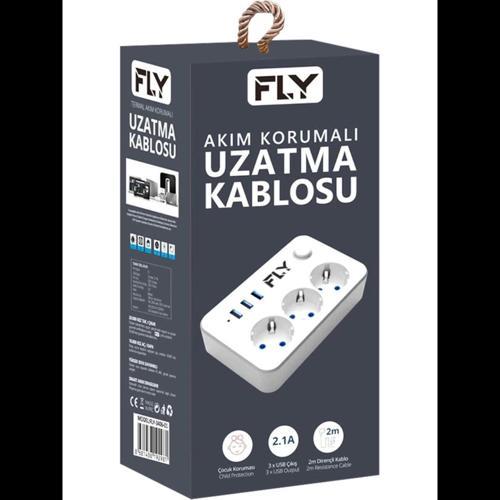FLY-3406 Akım Korumalı Anahtarlı Topraklı Çocuk Korumalı 3'lü Grup Priz (3'li USB Şarj Destekli) 2 Metre