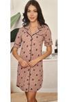 Boy Düğmeli Kısa Kol Gömlek Gecelik - Mini Ev Elbisesi Vizon M