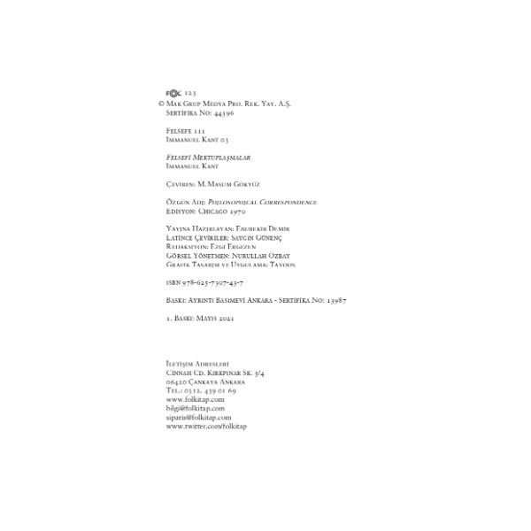Bu kitap, Immanuel Kant'ın felsefi yazışmalarından oluşmaktadır. Bu mektuplar, Kant'ın hayatı, tutumları ve felsefi fikirlerinin gelişimini gözler önüne sermesi açısından oldukça önemlidir.