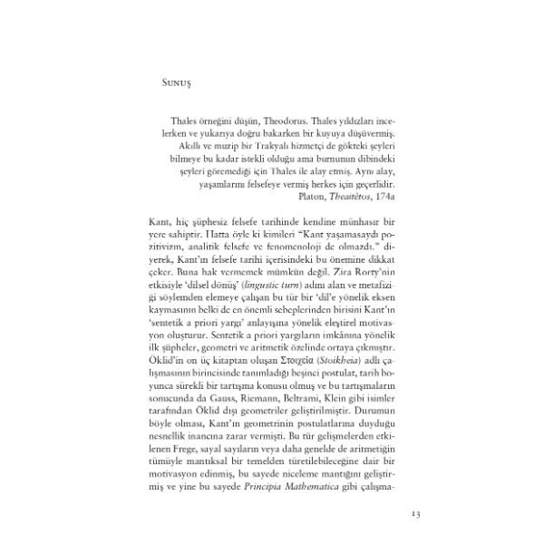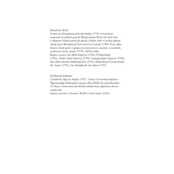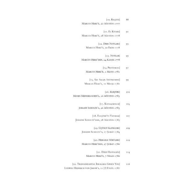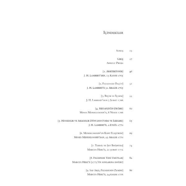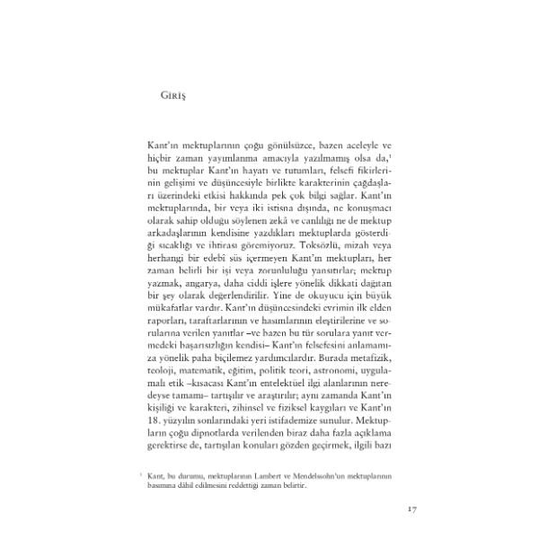 Kant'ın kişiliği ve karakteri, zihinsel ve fiziksel kaygıları yanında; Lambert, Mendelssohn, Herz, Schultz, Reinhold, Beck ve Fichte ile yazışmalarında 18. yüzyıl sonlarındaki Kant algısını da bizlere sunar.