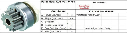 Form Metal Marş Dişlisi 12 Diş 12 Kanal Ford Transıt Ym Freze Az Icte Ters Donuslu T.Dön. Ds=12 Dkç=37,5 Boy=47 Ks=12 Bdç=12,1 Gç=50 (1 Ad )