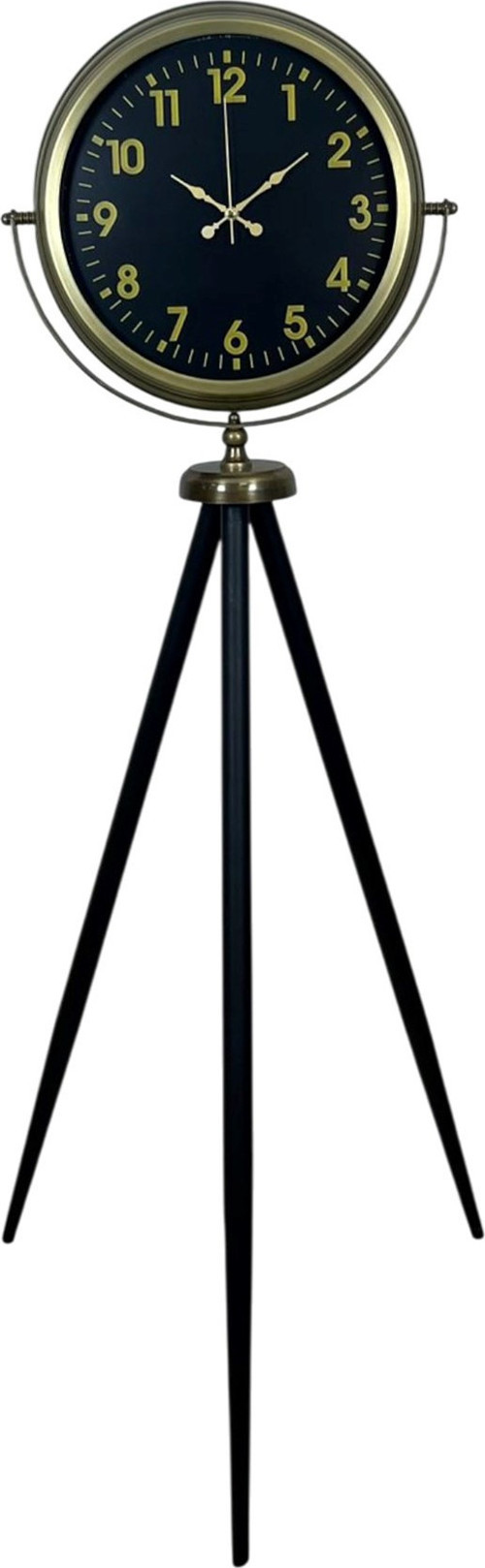 Bu modelde siyah kadran ile gold tonlu rakamların kontrastı, modern bir hava oluşturur. Büyük ve okunaklı rakamlar uzaktan bile rahat görülür; gündelik kullanımda pratiklik sağlar. Eskitme görünümlü metal kasa ve zarif detaylar, ürüne vintage bir karakter katar; tripod ayak yapısı ise modern bir “tasarım objesi” duruşu verir. Özellikle loft, endüstriyel, modern ve vintage dekorasyonlarda çok güçlü bir tamamlayıcıdır.