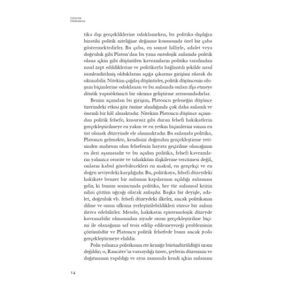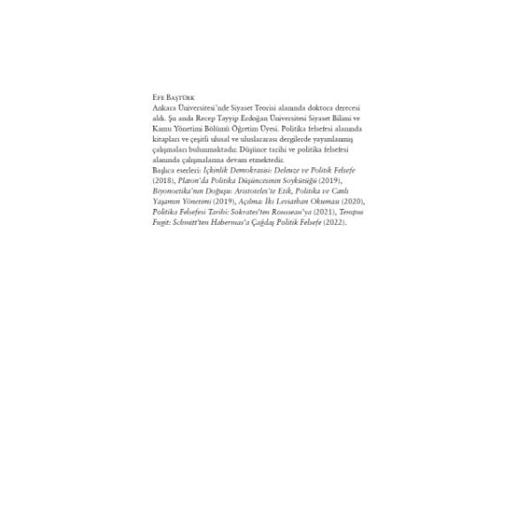 Bu kitap çağdaş felsefenin mimarları Foucault, Derrida, Agamben, Rancière ve Nancy’nin politik düşüncesinin izini sürüyor. Foucault’da delilik ve kapatılmadan Rancière’in Cahil Hoca’sına, Derrida’da tekillik ve konukseverlikten Agamben’de dil ve sessizliğe uzanan bir yol izliyor.