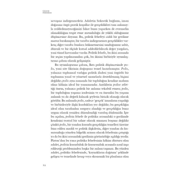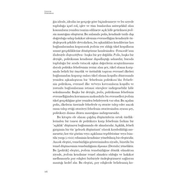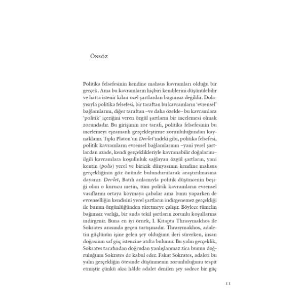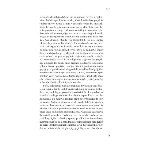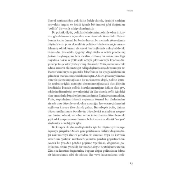 Bu kitaptaki ‘çağdaş’ düşünürlerin ortak problemi, polisin (kent devletinin) başlangıçtan beri idealize edilmiş bir mükemmelliği dayatma hakkı ve yetkisiyle ortaya çıkmasıdır. Politikanın birlikte düşünüldüğü kavram veya ilkeler yeniden ele alınmalı veya bu kavram setlerinin ‘politik’ nitelikleri gözden geçirilmelidir.