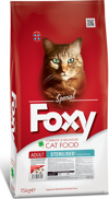 Hayvanlarda kısırlaştırma işlemi sonrasında, metabolik faaliyetlerdeki yavaşlama sonucu, kilo artışı söz konusu olur.Aynı zamanda besin madde tüketiminin fazlalığı kedilerde aşırı yağ birikimi ile kendini gösteren yaygın bir sorundur.Bu gibi durumlarda kedinin diyetinin protein bakımından zengin yağ bakımından düşük olması kilo kontrolü açısından önemlidir .Foxy cat sterilised kısırlaştırılmış ve obezite sorunu olan kedilerde kilo kontrolünü ve diğer besinsel ihtiyaçlarını karşılayacak şekilde formüle edilmiş tam ve dengeli bir mamadır.