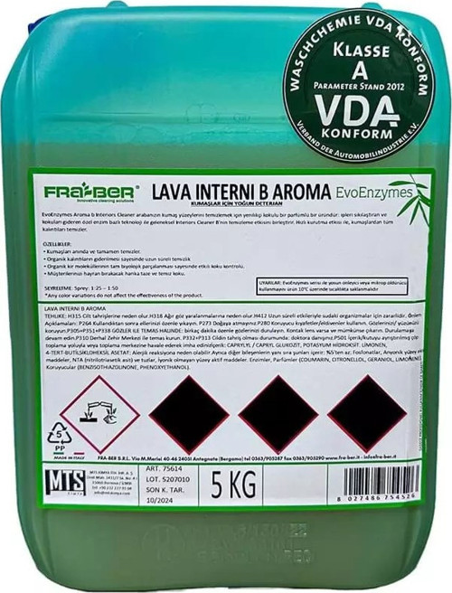 EvoEnzymes Aroma B, otomobilinizin kumaş yüzeylerini temizlemek için inovatif, kokulu üründür. Geleneksel Interiors Cleaner B'nin temizleme gücünü, lifleri sıkıştıran ve kötü kokuları yok eden özel enzim bazlı teknoloji ile birleştirir. Tüm kalıntıları kumaşlardan çıkarır ve hızlı kuruması avantajlarından biridir.