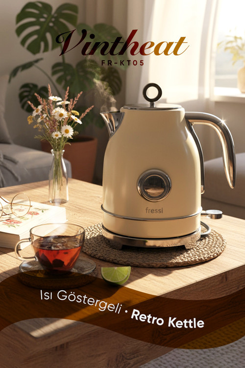 FR-KT05 Vintheat 1.7L Isı Göstergeli Retro Kettle – Zarafeti ve İşlevselliği Bir Arada! 🔹 Retro Şık Tasarım: Modern mutfağınıza nostaljik bir dokunuş katan retro tasarımı ile göz alıcı bir stil sunar.