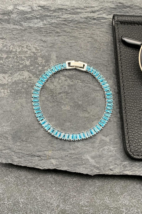 FRNCH 3A Kalite Baget Zirkon Taşlı Çift Kilitli Turkuaz Renkli Tennis Erkek Bileklik FRJ11496-1596-M
