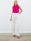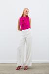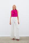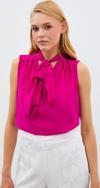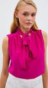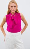 V yaka, kalça boy, fularlı kolsuz bluz.