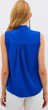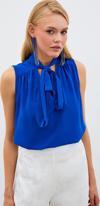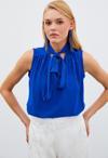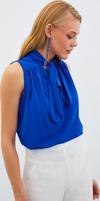 V yaka, kalça boy, fularlı kolsuz bluz.