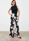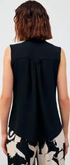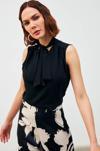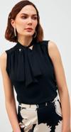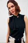 V yaka, kalça boy, fularlı kolsuz bluz.