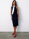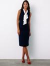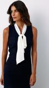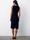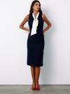V yaka, kolsuz, yan fermuarlı, iç astarlı, arkası yırtmaçlı, yakası birleşik fularlı tüvit elbise.