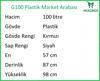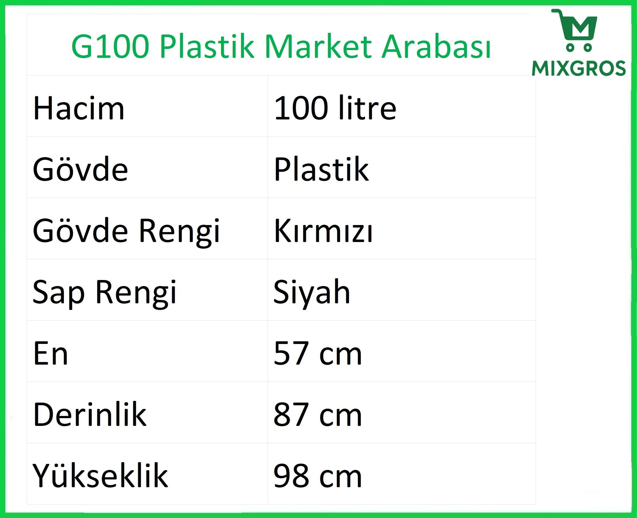 G100 plastik market arabaları 100, 130 ve 150 litre olarak üretilmektedir. Standart olarak kırmızı, turuncu, yeşil ve mavi renklerde sunulan G100 plastik market arabası, özel istek doğrultusunda farklı renk ve ölçülerde üretilebilmektedir. G100 plastik market arabasının sap kısımlarını özel istek doğrultusunda firma mağaza logonuz ile baskılı alma seçeneği de bulunmaktadır.