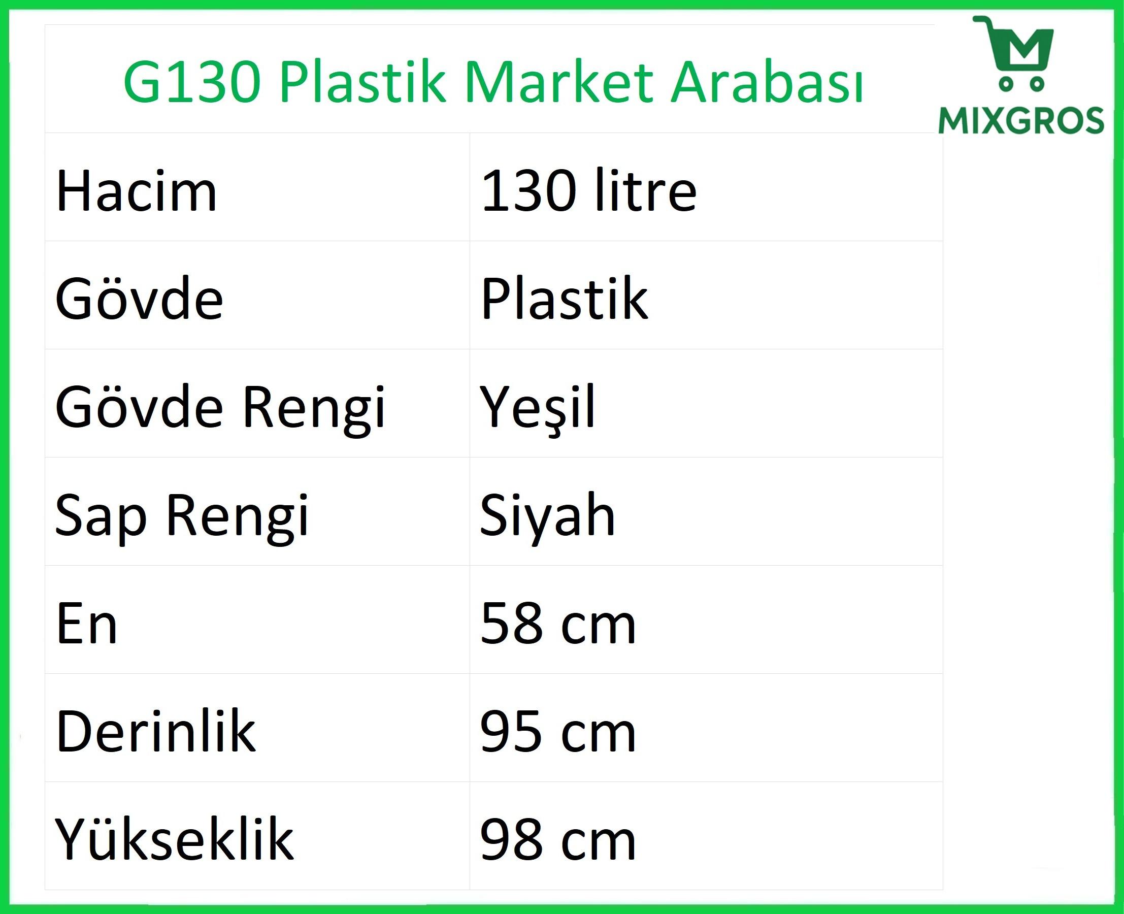 G130 130 Litre Plastik Market Arabasının özellikleri ve açıklamaları aşağıda verilmiştir. Farklı ölçü seçenekleri ve daha fazla bilgi için mağazamızı ziyaret edebilirsiniz.