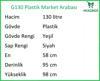 G130 plastik market arabaları 100, 130 ve 150 litre olarak üretilmektedir. Standart olarak kırmızı, turuncu, yeşil ve mavi renklerde sunulan G130 plastik market arabası, özel istek doğrultusunda farklı renk ve ölçülerde üretilebilmektedir. G130 plastik market arabasının sap kısımlarını özel istek doğrultusunda firma mağaza logonuz ile baskılı alma seçeneği de bulunmaktadır.