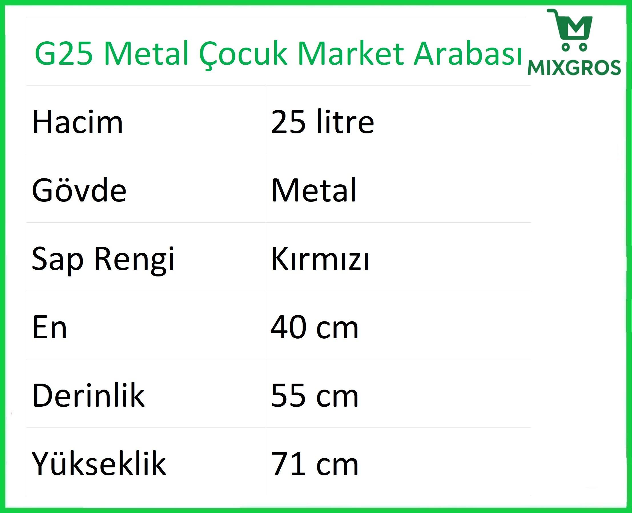 G25 metal çocuk market arabası 25 litre olarak üretilmektedir. Sap kısımları standart olarak kırmızı ve turuncu renklerde sunulan G25 metal çocuk market arabası, özel istek doğrultusunda farklı renk ve ölçülerde üretilebilmektedir. G25 metal çocuk market arabasının sap kısımlarını özel istek doğrultusunda firma mağaza logonuz ile baskılı alma seçeneği de bulunmaktadır.