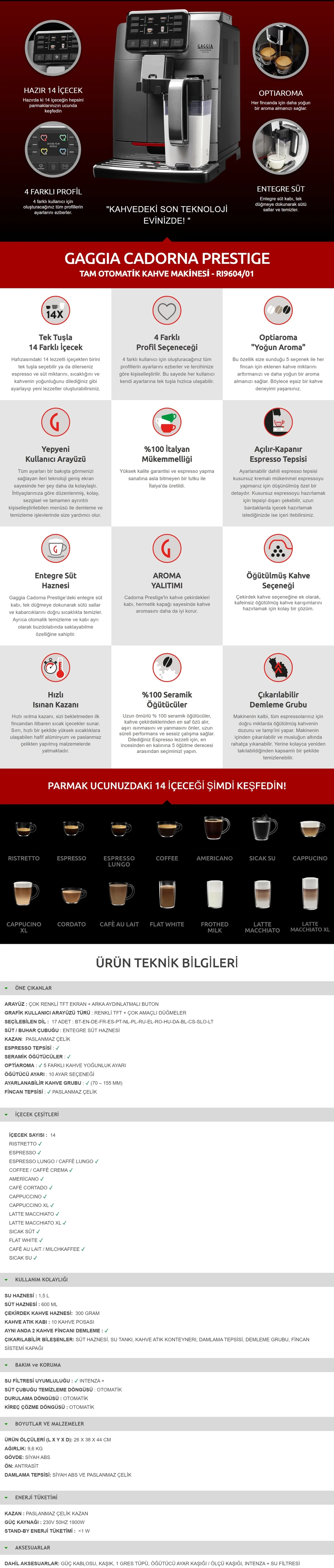 14 Farklı İçecek SeçeneğiGaggia Cadorna Prestige, tek dokunuşla hazırlayabileceğiniz zengin bir içecek yelpazesi sunar: