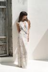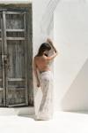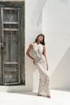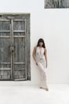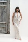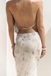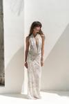Astarlı, desenli tül elbise. Halter yaka ve kolsuz. Asimetrik sırt dekolteli. Yandan dikişli gizli fermuarlı.