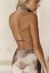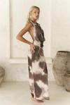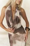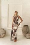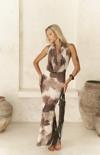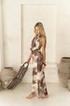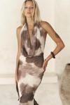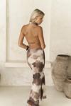 Astarlı, desenli tül elbise. Halter yaka ve kolsuz. Asimetrik sırt dekolteli. Yandan dikişli gizli fermuarlı.
