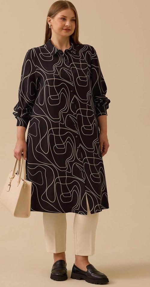 Detay: Desenli dokuma polyester kumaştan üretilmiş, relax kesim ve gömlek yaka tasarımıyla günlük şıklığı yansıtan bu midi boy tunik, uzun kol ve düğmeli kapama detayıyla hem zarif hem de fonksiyonel bir kullanım sunar. Normal bel formu sayesinde rahat bir siluet oluştururken desenli dokusu ile stilinize özgün bir hava katar. Günlük kombinlerden ofis şıklığına kadar geniş bir kullanım alanı sağlayan gömlek yaka midi tunik, gardırobunuzun vazgeçilmez parçalarından biri olmaya adaydır;