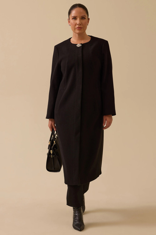 Detay: Bu kaban modeli, düz dokuma kaşe kumaşıyla hem sıcak tutar hem de şık bir görünüm sunar. Regular kesimi ve diz altı boyuyla klasik bir siluet oluşturur. Sıfır yaka ve takma uzun kol detayı sade bir duruş kazandırır. Çıt çıtlı kapama ve aksesuar detaylarıyla modern bir dokunuş sunar;