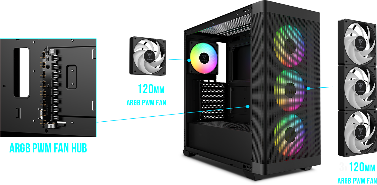 DAHİLİ FAN İLE 4 ARGB PWM FAN Dört adet dahili sessiz PWM ARGB fana sahip olan kasa, olağanüstü aydınlatma ve minimum gürültüyle ince ayarlı hava akışı sağlar. Dahili 8 portlu PWM ARGB fan göbeği, kolay yönetim ve senkronizasyon sağlayarak, fanların yüksek performanslı ve sessiz çalışmasını mükemmel şekilde tamamlayan uyumlu bir aydınlatma düzeni sağlar.