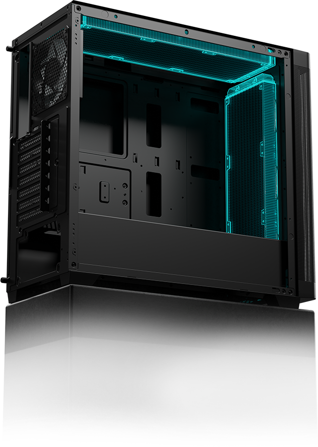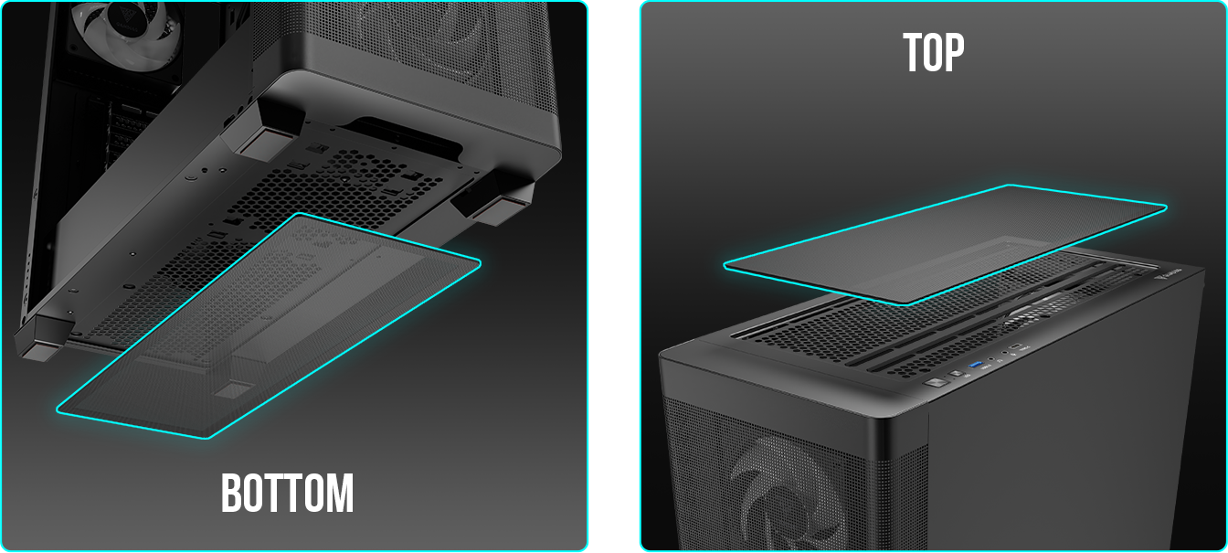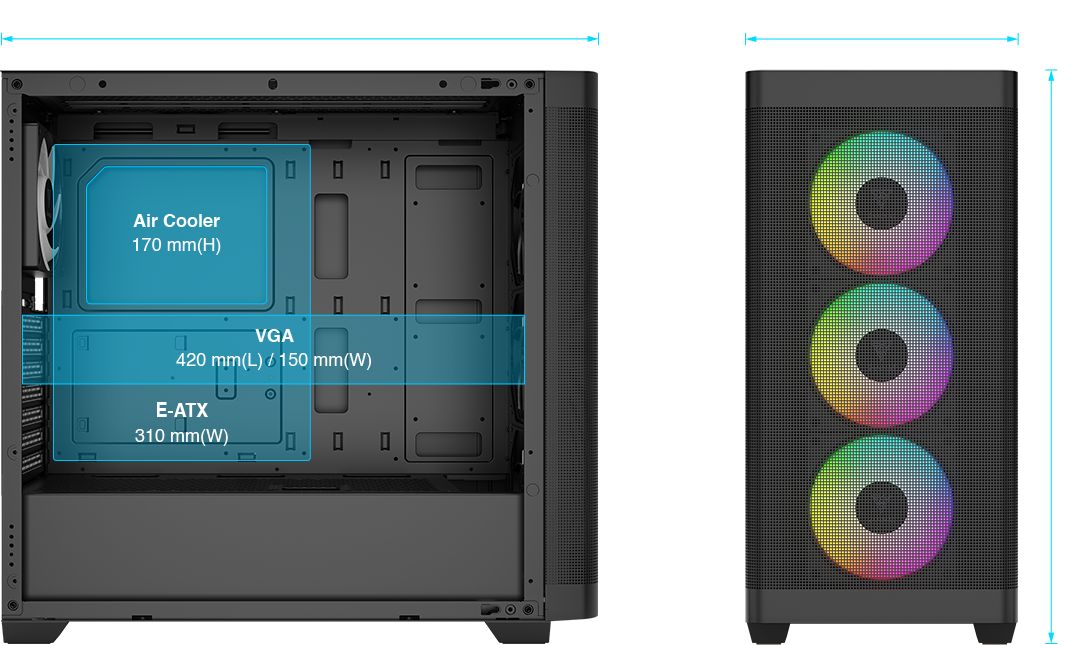 | SOĞUTMA UYUMLULUĞU Kasa, üstte üç adet 120 mm veya iki adet 140 mm fana, önde ve üstte ise 240 mm veya 360 mm radyatörler için birden fazla montaj noktasına sahiptir. Ayrıca, 170 mm'ye kadar yüksekliğe sahip CPU soğutucularını da destekler. | |